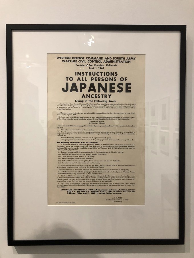 Aan Lange werd gevraagd om zich te concentreren op het koken, slapen, bidden en socializing van de mensen. En toen was er Pearl Harbor en dit:”In March of 1942, the military began posting Civilian Exclusion Orders, which ordered “all persons of Japanese ancestry” to report to Civil Control Stations to register, and begin the process of “evacuation” to nearby Assembly Centers and eventual consolidation into Relocation Centers in remote areas across the Western United States. Within the next weeks, all Japanese people living in the west coast—approximately 120,000—were rounded up and forced to quickly store, sell, or give up their homes, businesses, and property. They were imprisoned in concentration camps through World War II, until the camps were slowly decommissioned by 1946. Over two-thirds of those imprisoned were U.S. citizens, and many more had lived in the United States for decades but were prevented from becoming naturalized citizens by existing immigration laws.”