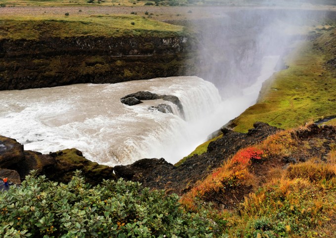 Een heel grote en imposante waterval met een wolk van mist gevormd door het opspattend en wegvliegend water. Rechts zie je ook de verschillende tinten groen met een beetje oranje/rood erdoor. Aan de linkerkant, bij de groene blaadjes, zie je een oranje “plekje”. Dat is een mens. Natuurlijk valt het oog op het witte gedeelte van de waterval, pal in het midden van de foto. Dan volg je het wit van het opspattend water en kom je terecht in het groene gedeelte. Daardoor zie je ook het rode (op een sterk punt van de foto) en ga je via de groene blaadjes naar de mens waardoor je een beter idee krijgt van hoe groot deze waterval wel is. Wat ook altijd werkt in foto’s, zijn driehoeken.