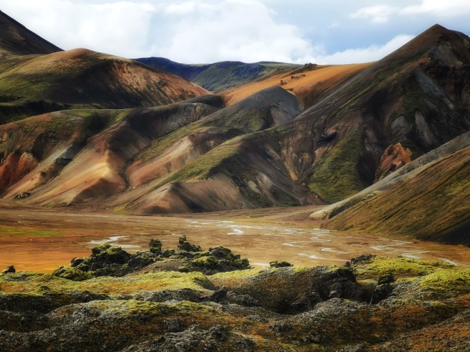 Deze foto heb ik geselecteerd omdat ik hier verschillende minuten heb staan kijken naar deze plaats met open mond. Ik hou van de schilderkunst maar geen enkele schilder kan zoiets creëren. Dit is van het mooiste en sereenste dat ik al gezien heb. Het is bijna magisch. En de indrukwekkende stilte. Op de voorgrond krijg je de platte en soms ronde vormen waar het groene domineert. Dan volgt een platte gele streep en daarachter het bruinige met wat donkere plekken en strakke maar parallelle lijnen die naar de hemel leiden. En helemaal bovenaan krijg je dan weer de ronde, witte vormen van op de voorgrond. Eigenlijk moet je van deze plaats een panoramafoto maken. Dit gebied dat luistert naar de naam Landmannalaugar staat in mijn persoonlijke top drie van “mooiste” gebieden.