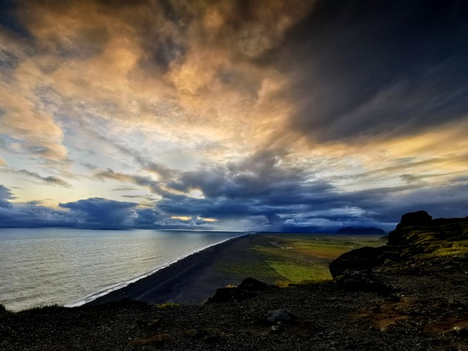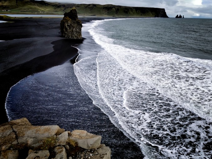 Op verschillende plaatsen in IJsland duiken van die grillige stenen op “uit het niets”. En uit het water. Op deze foto zijn het weer de golven die dienst doen als leidende lijnen en die het oog meenemen tot aan de heel herkenbare “rotsen” van Vik. Vorig jaar kon je nog te voet  via het strand naar een klein dorpje in de buurt. Een paar maanden geleden is er een stuk van stijle wand naar beneden gekomen en blokkeert nu die passage. Drie dagen voor ik deze foto genomen heb, mochten we het strand niet op wegens te gevaarlijk. Op het sterk punt bovenaan links zie je nog zo’n ding “dat uit de grond” komt en waarvan je je afvraagt hoe en waarom het juist daar “gebouwd” is.
