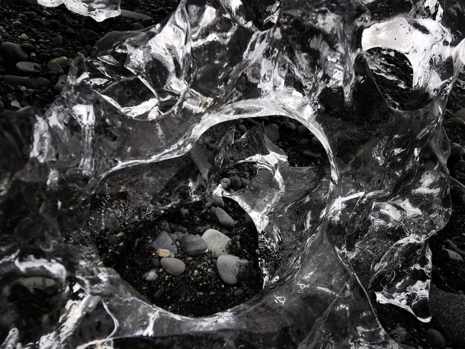 Deze foto heb ik gemaakt op de fameuze “diamond beach”. Het zijn dus stukken ijs die aanspoelen en dan letterlijk wegsmelten. Op zich niks spectaculairs tot men die dingen van dichterbij gaat bekijken. Elk stuk ijs is op zich al uniek en je ziet de grilligste vormen die de natuur rijk is. Om deze foto te maken moet je op je knieën gaan zitten en continu bewegen. Op en neer, links en rechts, naar voor en naar achter en dan opeens zeg je, “dat is ‘m”. Omdat de vormen zo grillig zijn, krijg je bij elke beweging die je maakt een totaal andere foto omdat de lichtinval iedere keer verschillend is. Wanneer dat ijs, dat op het strand ligt, ook nog eens bevochtigd wordt door de golven, dan krijg je nog een ander effect: het water en vooral het schuim dat onder en door die blokken loopt. Wanneer je kijkt naar de stenen die te zien zijn in de opening van deze diamant dan zie je dat deze foto wel degelijk een kleurenfoto is. Op dit strand kun je ook uren foto’s blijven maken maar ik wou een foto maken waarbij het duidelijk was wat je zag, zonder uitleg … 😉