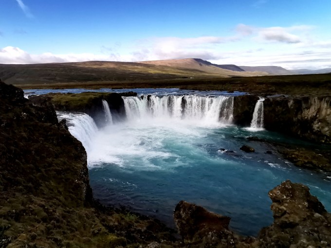En voor de zoveelste keer sta je voor een waterval. Ook een mooie omdat die bijna een halve cirkel vormt. Bij deze waterval kreeg ik een half uur om foto’s te maken want dan moesten we verder rijden. Het is altijd een goed idee om foto’s te bekijken die op internet staan en vervolgens die locatie eens te bestuderen op Google Maps. Indien ik dit gedaan had, dan was ik naar de overkant gegaan om mijn foto’s te maken … Iets anders waaraan ik getwijfeld heb, is de voorgrond die je nu ziet. Voeg ik die eraan toe of laat ik die weg? Ik kon niet meer naar links opschuiven omdat daar een afsluiting was. Ik heb foto’s gezien van de volledige waterval genomen vanaf het punt waar ik stond. Ofwel zijn die dan genomen met een drone ofwel respecteren die mensen de afsluitingen niet. Of … ik hoop echt van niet, ik heb een weggetje gemist of niet gezien. Wat mij hier aanspreekt is het spel van blauw en wit zowel in de lucht als het water.