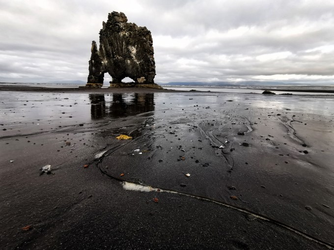 Je parkeert je wagen, loopt enkele honderden meters en dan kom je aan een houten platform en daar staat ie dan: de eenzame olifant. Je moet wel eerst naar beneden, naar het strand en dat is niet zo evident. Gelukkig was het die dag droog; bij het nat weer is deze afdaling gevaarlijk denk ik. Er zijn “lonely trees” en in IJsland is er de “lonely elephant”. Hier heb ik ook een half uur rondgelopen om dat dier te bekijken vanuit allerlei standpunten. Uiteindelijk heb ik de foto genomen vanop een statief dat zelf op een paar centimeters van de grond stond. De streep die rechts beneden begint, helpt bij het bekijken van de foto. Dat doet het gele steentje trouwens ook. Ik had graag wat meer reflectie gehad in het water maar dan moest ik voorgrond opgeven en dat wou ik niet. Ook hier zie je weer aan het gele en de rode steentjes dat het om een kleurenfoto gaat.