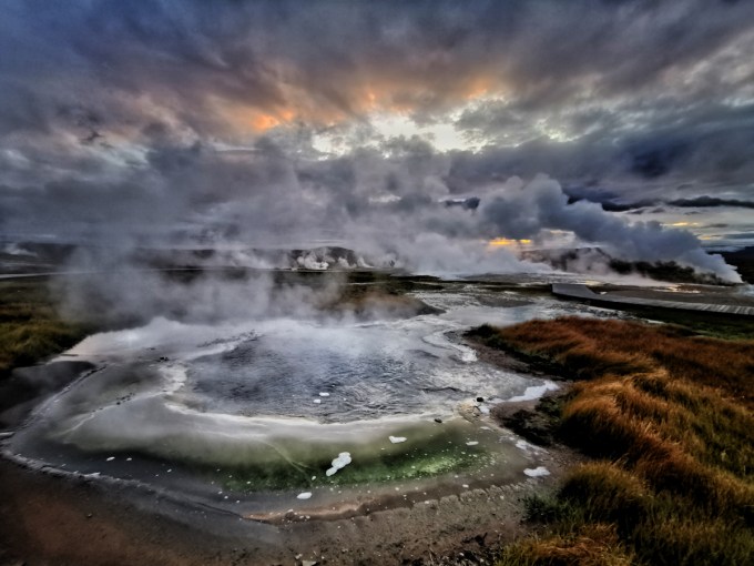 Wanneer je de “Golden Circle” doet dan is “Geysir” een van de aanraders. Het is een geiser die om de zoveel minuten een grote hoeveelheid heet water de lucht inspuwt. Wanneer je foto mislukt is of je staat te ver of te dicht, geen probleem, een paar minuten wachten en je kan herbeginnen. Succes gegarandeerd, inclusief de tientallen toeristen die rond de geiser staan al dan niet met selfie-stick. Dit is toch intrigerend dat wij op een aardkloot rondlopen met een kern die verschroeiend heet moet zijn. Bovenstaande foto is genomen in het noorden maar met dat verschil dat hier geen geisers zijn die water meters de hoogte instuwen. Er zijn wel gaten in de grond met borrelend water of modder. De hitte zorgt dan ook voor interessante kleurpaletten wegens de verkleuring van de omliggende grond deels door de hitte en deels door de vrijgekomen stoffen/gassen. Wanneer je een bad neemt in zo’n “natuurlijke badkuip” dan komt de zwavelgeur je tegemoet. In deze foto zie je voornamelijk een grijs spektakel: het komt van het water dat opborrelt op de voorgrond, dan zijn er gewoon gaten in de grond waar pure stoom uitkomt (geen water te zien) zoals rechts in de foto en die slierten maken de verbinding met de grijze wolken met wat ochtendzon erdoor. Het toffe aan deze foto is dat je twee keer moet kijken vooraleer je begrijpt wat je ziet.
