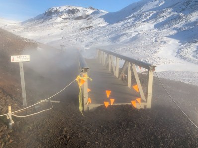In elk geval, op verschillende websites lees je dan dat het een klim is van een uur, anderhalf uur of zelfs twee uur. Op zo’n 700 meter van de top staat een bord met daarop een pictogram van iemand in een bad. En dan denk je dat je binnen een kwartier in een natuurlijk warm “bad” gaat zitten. Maar … op zo’n twee- tot driehonderd meter moet je over een brugje en daar mag je dan niet meer verder. Zonder uitleg. Er zijn ook twee linten gespannen om mensen “tegen te houden”. Het is echt duidelijk dat er idioten zijn die dit niet respecteren.