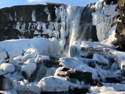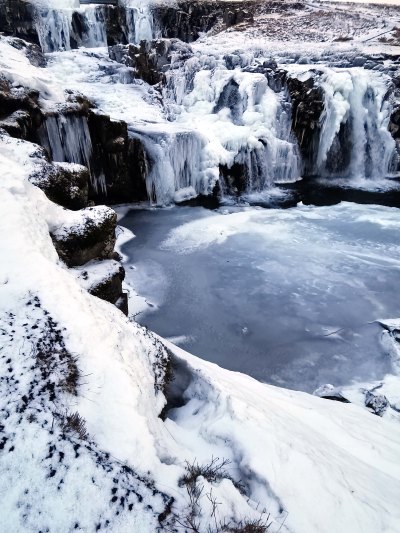 Natuurlijk is er ook een waterval en een mooie. Wat deze mooi maakt, is het contrast tussen het “witte” water en de zwarte stenen. Zeker wanneer deze laatste nat zijn. Nu zijn er geen zwarte stenen te bespeuren want ze zijn bedekt met een dikke laag ijs en sneeuw. Wanneer je dan naar boven kijkt, zie je nog een eerder dun straaltje naar beneden komen. Het grote geweld is gewoon gestopt. Bevroren. En stil. Toch speciaal dat zo’n kracht toch min of meer bedwongen kan worden.