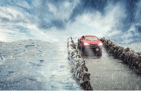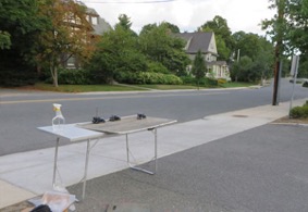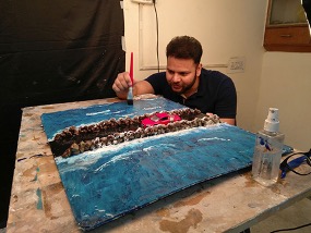 Zowat alle elementen van de foto zijn zelf gemaakt; met uitzondering van de auto. Op de rechterkant zie je de spraybus staan om de regen te simuleren.