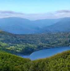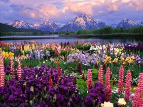 De foto valt uiteen in vier stroken: lucht, bergen, water en bloemen. Veel bloemen want ze nemen bijna twee derden van de foto voor hun rekening. Alleen, die bloemen groeien daar niet! Dit is een samenvoeging van twee foto’s.
