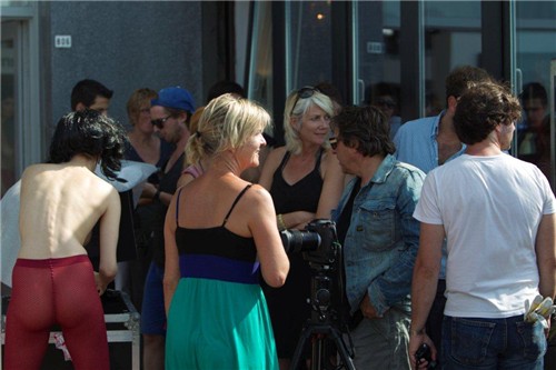 De fotograaf die kijkt, het model dat luistert en de presentatrice die spreekt.